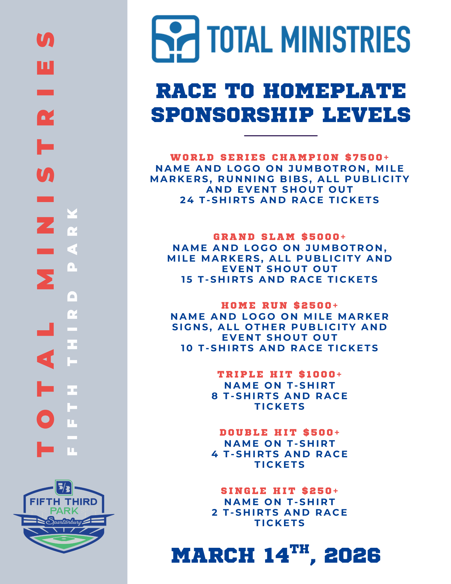 Sponsorships: View sponsorship levels here and call TOTAL Ministries at 864‑585‑9167 to set up your sponsorship.